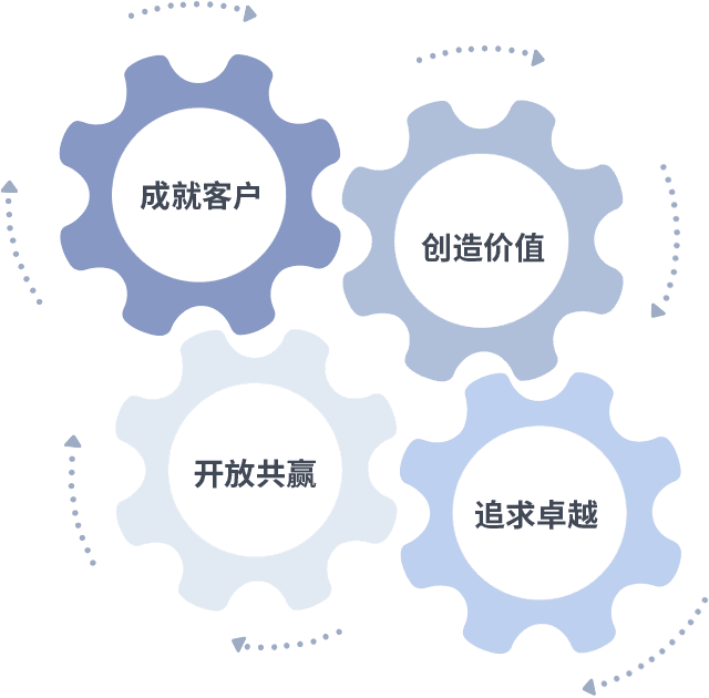 成就客户是一切决策的出发点,,创造价值是衡量所有工作的标准,,,追求卓越是我们做事做人的态度,,,开放共赢是我们的格局也是最终的结果。。价值观的齿轮环环相扣,,推动着组织里的每个人不断向前。。。。